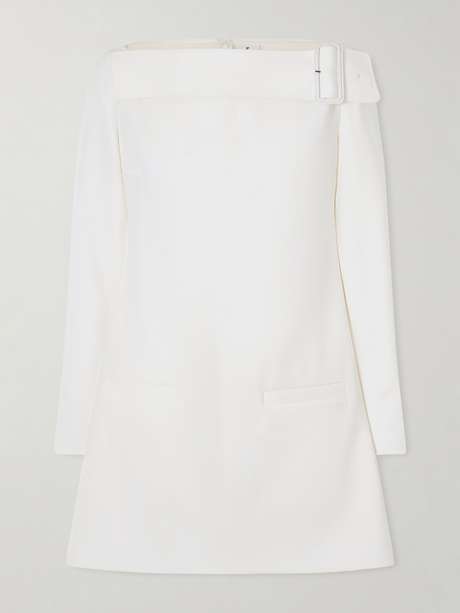 Die Einflüsse der futuristischen Kreationen von Courrèges lassen sich auch an diesem schicken Minikleid erkennen. Das Modell besteht aus Crêpe und zeigt sich am U-Bootausschnitt mit der charakteristischen Schnalle des Hauses. Wir kombinieren es mit schlichten hohen Schuhen und skulpturalen Accessoires.