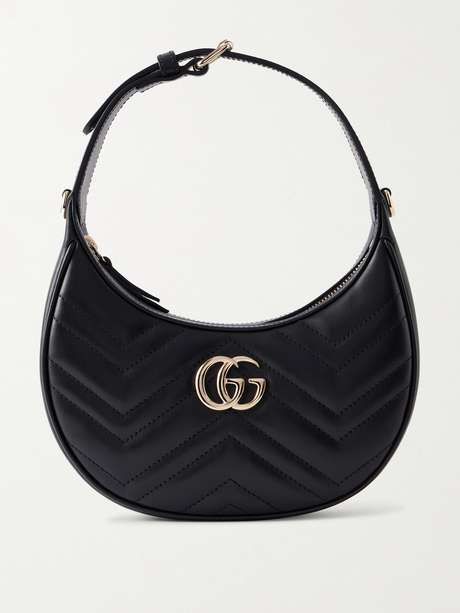 Die „GG Marmont“ Schultertasche von Gucci hat eine kompakte Halbmondform und ist mit einem abnehmbaren Kettenriemen ausgestattet. An dem Ledermodell zeigt sich das 2016 eingeführte und mittlerweile klassische Steppmuster der Kollektion. Im Inneren ist Platz für Ihr Smartphone, ein Kartenetui sowie einen Lippenstift.