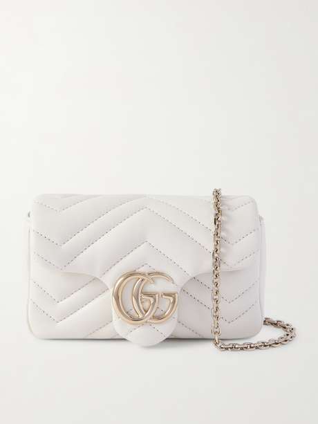 Für die „GG Marmont“ Taschenreihe von Gucci diente das glamouröse Vintage Flair des Hotels „Chateau Marmont“ in Los Angeles als Inspirationsquelle. Diese Minivariante wurde in Italien aus Matelassé-Leder gefertigt und mit einem goldfarbenem Logodetail sowie einem abnehmbaren Kettenriemen gestaltet. Im Inneren findet sich ausreichend Platz für Kartenetui, Lippenstift und einen Schlüsselbund.