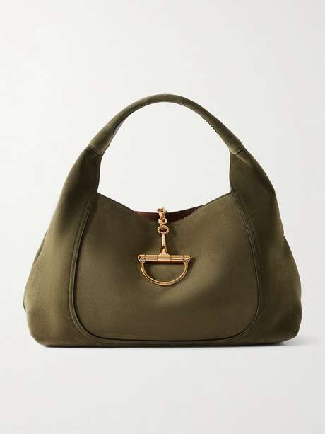 Diese Tote von Gucci wurde mit einer Hälfte des „Horsebit“-Details verziert, das zum Teil auch als Verschluss fungiert. Das Accessoire besteht aus olivgrünem Veloursleder und ist unverstärkt, weshalb es sich bequem unter dem Arm tragen lässt. Es hat ein glattes Mikrofaserfutter und bietet ausreichend Platz für Smartphone, Schlüssel und Puderdose sowie ein großes Portemonnaie.