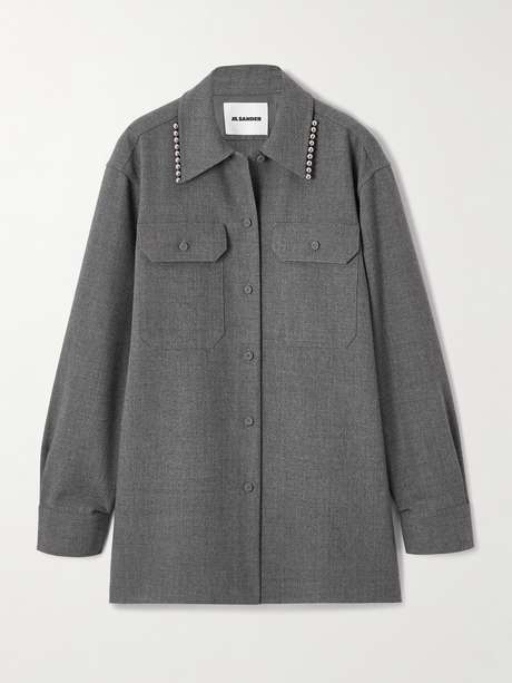 Die H/W 25-Kollektion von Jil Sander handelt vom Übergang von Dunkelheit zu Helligkeit. Dieses Hemd war bei der Laufstegshow in Kombination mit dem passenden Rock sowie einem Gürtel mit silberfarbenen Details zu sehen. Das Modell wurde aus Wolle gefertigt und mit Pattentaschen im Utility-Stil sowie silberglänzenden Zierperlen gestaltet.