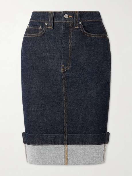 Der „Kendra“ Rock von KHAITE zeichnet sich durch einen umgeschlagenen Saum aus, der eine Art dekonstruierten Charme versprüht. Das hoch sitzende Modell wurde aus dunkelblauem Denim gefertigt und in einer Bleistiftsilhouette gestaltet, die mit kontrastierenden Nähten durchzogen ist. Lassen Sie sich vom Styling der F/S 26-Laufstegshow inspirieren und tragen Sie die „Franc“ Jacke dazu, welche Sie ebenfalls in unserer Auswahl finden.