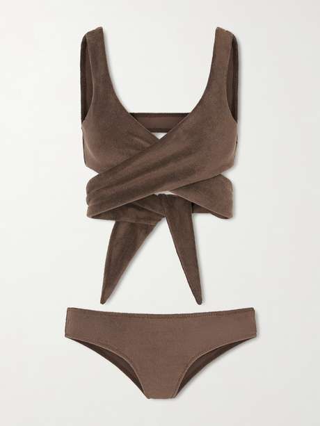 Der „Marie-Louise“ Bikini von Lisa Marie Fernandez versprüht Retro-Glamour. Das Ensemble aus schnell trocknendem Frottee setzt sich aus einem Oberteil, das um den Körper gewickelt wird, und einem minimalistischen halbhohen Höschen zusammen. Dazu passen große Sonnenbrillen und Leinenhemden.