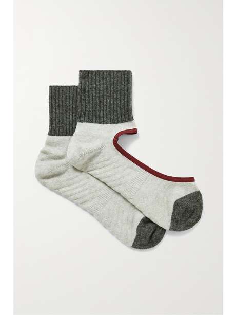 Diese Yogasocken von Loro Piana haben bordeauxrot eingefasste Cut-outs am Fußrücken, die während des Workouts für Ventilation und Flexibilität sorgen. Das Modell besteht aus Kaschmir in verschiedenen Grautönen und zeigt sich mit gerippten Bündchen.