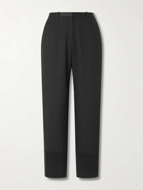 In der „Mahoney“ Hose von Loulou de Saison kommen Smokinganklänge und Pariser Chic zusammen. Das Modell aus Crêpe mit Wollanteil hat ein gerades Bein und ist an Bund wie Beinabschluss mit Satin besetzt.