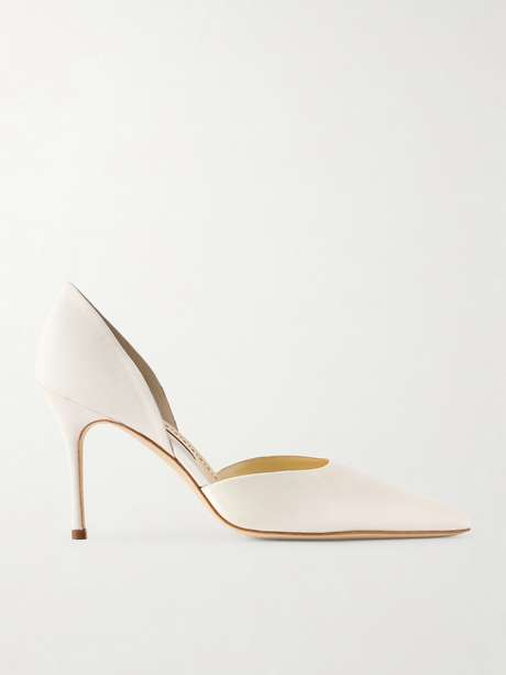 Manolo Blahnik wird mit zeitloser Eleganz in Verbindung gebracht und ist seit langem ein Favorit von Bräuten. Die „Taylerbinu“ Pumps aus glänzendem Satin laufen an der eleganten Kappe spitz zu und verströmen auf schlichte Weise edles Flair, das sich mit einer minimalistischen Robe wunderschön unterstreichen lässt. Tragen Sie das Paar zu einem Minikleid als zweites Outfit, damit sowohl für die Trauung als auch die Feier danach die Looks feststehen.