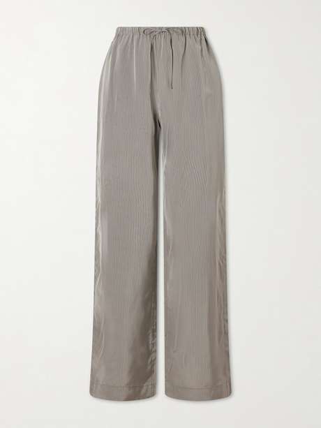 Diese bequeme Hose von RÓHE hat Pyjama-Anklänge. Sie besteht aus gestreiftem Satin und hat einen elastischen Kordelzugbund sowie ein weites Bein, das bis zum Boden reicht. Wir stecken ein Top in den Bund und runden den Look mit flachen Schuhen ab.