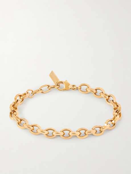 Dieses goldfarbene Armband von SAINT LAURENT könnte auch aus einer Vintage-Boutique stammen. Es setzt sich aus länglichen Gliedern zusammen und wurde mit einer kleinen Logoplakette verziert. Dank des Karabinerverschlusses lässt sich das Modell ganz leicht in der Länge anpassen.