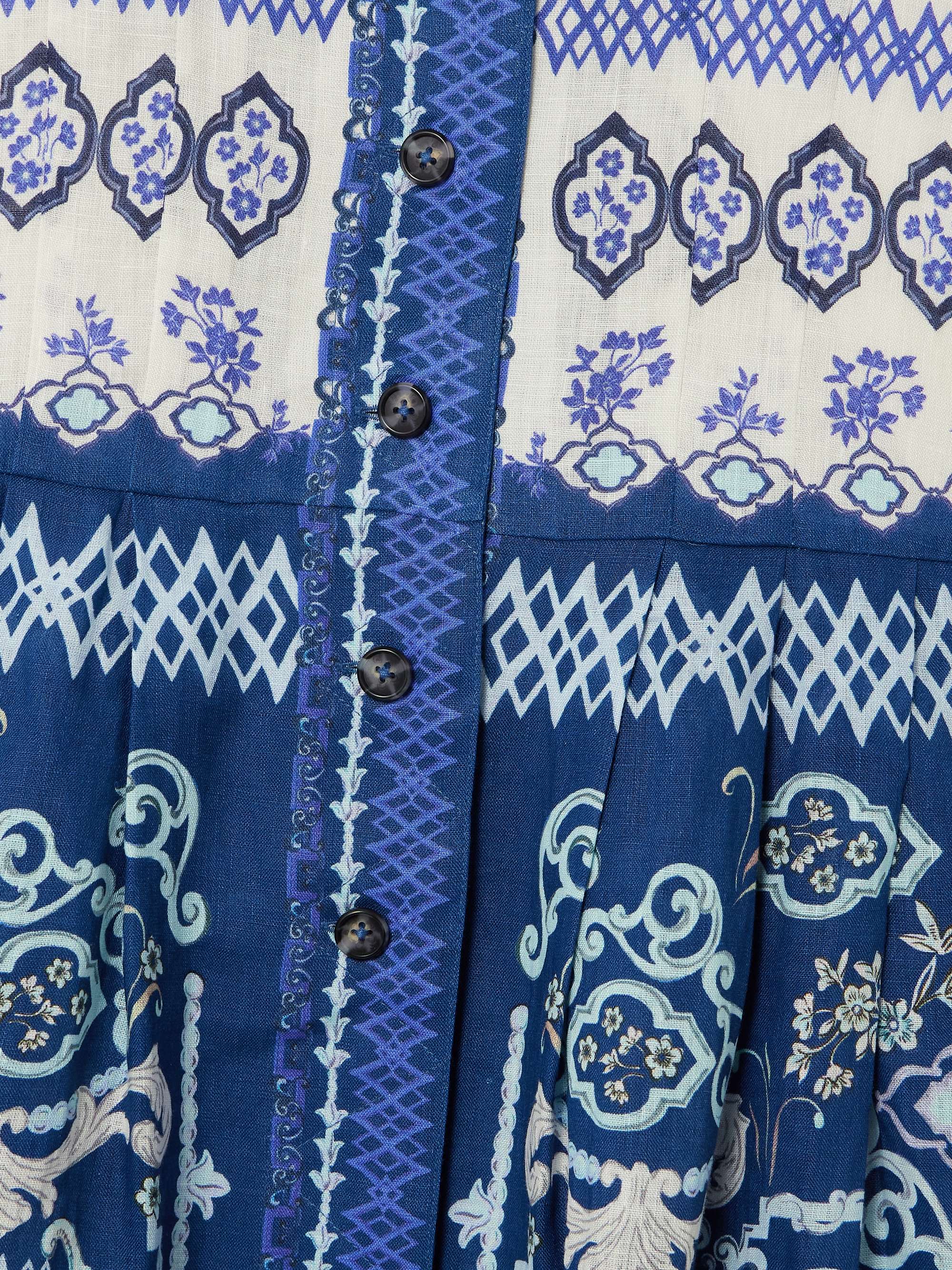 Das „Nya“ Hemdblusenkleid von Saloni ist mit dem „Riviera“-Print der Marke bedruckt, welcher optisch auf den Motiven antiker venezianischer Textilien beruht. Das Modell aus weichem, luftigem Leinen ist locker gehalten, wozu im Rockbereich auch die ansprechenden Falten beitragen, und wird mit einem passend gestalteten Gürtel tailliert.