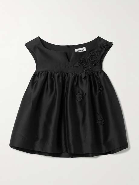 Dieses Oberteil von SHUSHU/TONG zeichnet sich durch die markante Raffung unterhalb des Schlüsselbeins aus, die Volumen erzeugt. Es wurde aus Crêpe gefertigt und an einer Seite mit Blütenapplikationen sowie glitzernden Perlen verziert.