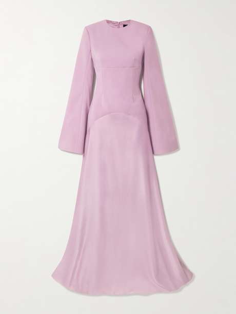Die „Claudine“ Robe aus Crêpe von Solace London wirkt sowohl modern als auch zeitlos und liegt am Oberteil an, wobei sie in ausgestellte Ärmel sowie einen Satinrock übergeht, der elegant fließend fällt. Der „Wisteria“-Hellrosaton harmoniert wunderbar mit Silber- oder Diamantschmuck.