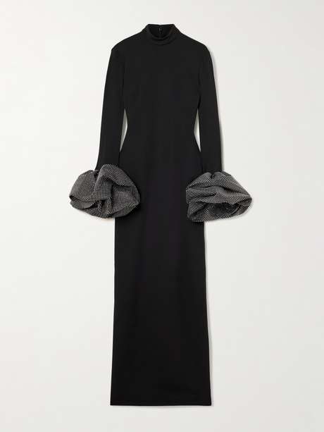 Die „Viviana“ Robe von Solace London ist ein hervorragendes Beispiel für die markante und dennoch elegante Ästhetik der Londoner Marke. Das bodenlange Modell besteht aus optisch formendem Cady und betont die Figur. Zudem zeichnet es sich durch einen Stehkragen sowie skulpturale Ärmelabschlüsse aus, die über und über mit Kristallen bedeckt sind. Wir empfehlen farblich passende High Heels dazu.