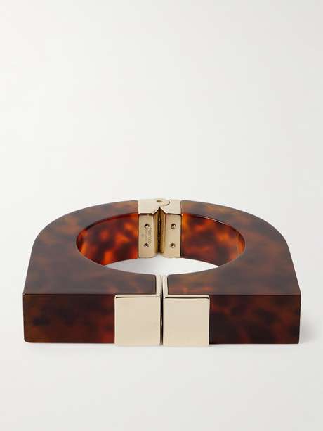 Dieser Armreif von TOM FORD bildete auf dem H/W 25-Laufsteg einen markanten Kontrast zu den fließenden Stoffen und den zarten Pastellfarben. Das Modell aus Plexiglas® in Hornoptik zeigt sich mit goldglänzenden Details.