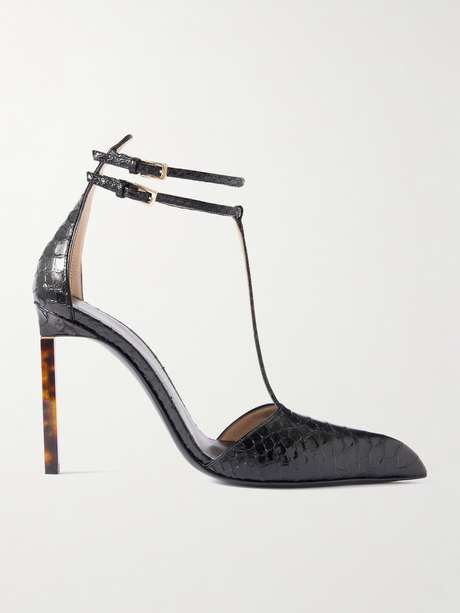 Diese Pumps bildeten bei der H/W 25-Laufstegshow von TOM FORD die Basis für etliche Looks, was auf ihre Vielseitigkeit und die gelungene Gestaltung hinweist. Das Paar wurde in Italien aus Leder mit Schlangeneffekt gefertigt und mit einer spitzen Kappe sowie einem schicken T-Riemen versehen. Der Absatz ist 105 Millimeter hoch und besteht aus Harz in Hornoptik.