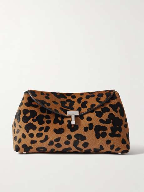 Dank des Leopardenprints ist die „T-Lock“ Clutch von TOTEME ein echtes Statement-Accessoire. Das unverstärkte Modell mit Umschlagklappe wurde aus griffigem Kalbshaar gefertigt und mit einem silberfarbenen Verschluss designt. Standfüße an der Unterseite schützen zudem vor Abnutzung. Das Innere bietet Platz für Smartphone, Kartenetui und Lipgloss.