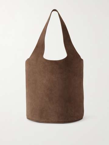 Andiamo medium shearling-lined leather-trimmed intrecciato suede tote