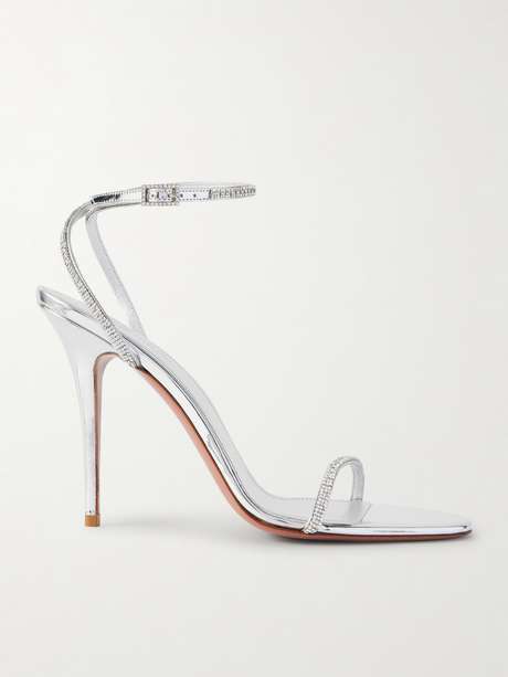 Amina Muaddi's collections are favored for their sculptural lines and sense of modern glamour. These 'Diamante' sandals are made from silver leather and have sleek straps encrusted with crystals that catch the light. They're set on 105mm stiletto heels, offering dramatic lift.