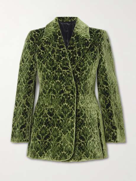 Burberry's blazer made a statement on Daniel Lee's Fall '25 runway at the Tate Britain – the show was a celebration of creativity. Tailored from velvet-jacquard, it has padded shoulders and is adorned with damask that would look right at home on the walls of grand stately homes. The Rococo-inspired style is framed by peak lapels with a single-breasted profile – team yours with the matching pants.