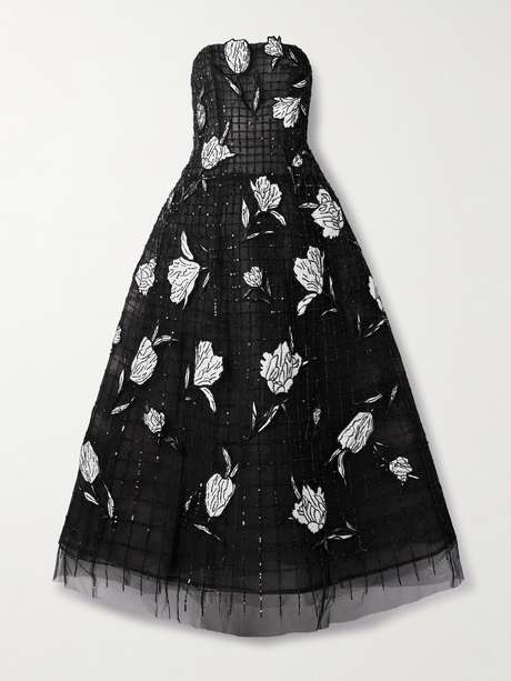 Carolina Herrera’s strapless gown is tailored in a structured shape that highlights the waist before falling to a voluminous flared skirt. Made from sheer black tulle appliquéd with bold white florals, it’s accented with a delicate grid of beading that catches the light beautifully.