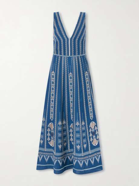 Emporio Sirenuse’s 'Nellie' dress is made from an airy linen-cotton blend and embellished with 'Ballerina' embroidery. It has a fitted bodice with a V-neckline that opens into a flared, flowing maxi skirt.