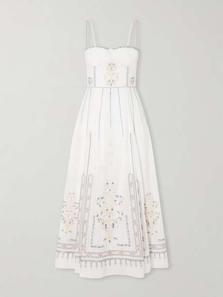 Emporio Sirenuse’s 'Valya' dress is cut from cotton-poplin with a fitted bodice that opens into a flared pleated skirt. It’s embroidered with a Persian-inspired motif of floral and geometric shapes.