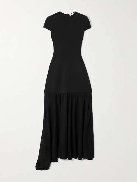 FFORME's 'Sienna' dress is crafted using a compact knitting technique that creates a smooth, supple finish, designed to softly contour the frame. Made from a wool blend, it’s contrasted with a tiered, asymmetric skirt in a finer gauge.