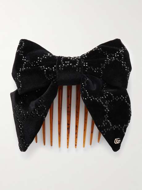 Gucci's bow-shaped hair clip is the perfect finishing touch for holiday looks. It's made from plush velvet and decorated with tonal crystals in the shape of the 'GG' motif. The tortoiseshell-effect acetate comb slips easily into loose waves or a braid.