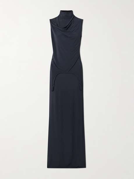 Jean Paul Gaultier's turtleneck dress is subtly subversive. It's cut from stretch-jersey with a draped neckline and detailed with garter straps below the waist. Wear yours with point-toe pumps.