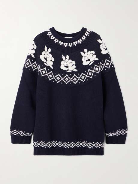 Magda Butrym's sweater is intarsia-knitted with flowers and geometric motifs. It's made from cozy, insulating wool in a relaxed shape defined by ribbed trims and dropped shoulder seams. Wear yours with a T-shirt peeking out from beneath.