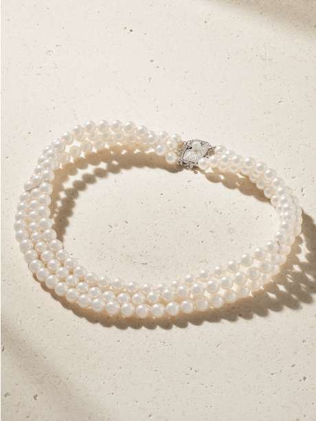 MIKIMOTO's choker has a vintage elegance to it. Crafted from 18-karat white gold, it's strung with three strands of Akoya cultured pearls and secures with an ornately detailed clasp.