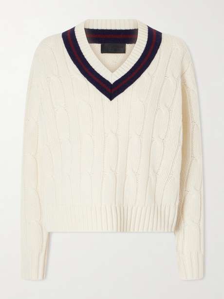 Nili Lotan’s 'Fabiana' sweater is spun from wool in a classic cable-knit with a deep V-neckline framed by contrasting trim. The relaxed silhouette and ribbed finishes nod to heritage athletic styles. Layer it over a crisp shirt or wear it solo with tailored pants.
