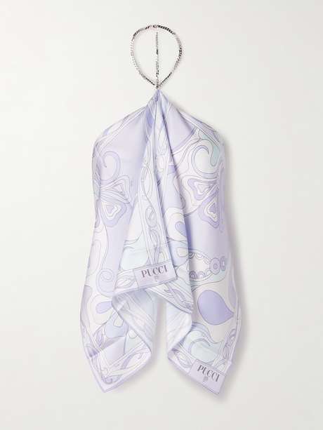 PUCCI's tank is patterned with the house's archival 'Orchidee' motif. Cut from silk-twill, it has a fluid, scarf-like drape and halter neckline with slinky chain straps.