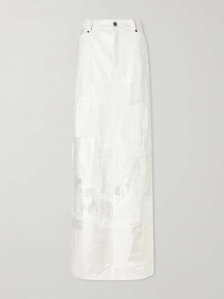 Ralph Lauren Collection's 'Natallia' maxi skirt reimagines denim styles through distressed patchwork. Reference the Spring '26 collection and style it with a shirt and strappy sandals.