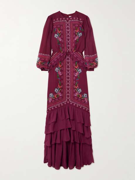 The 'Cordia Vine' print on Saloni's 'Isa Long-C' dress is inspired by folky, '70s styles. Made from silk crepe de chine, it tucks in at the waist and falls to a swishy, tiered hem. Style yours with platforms and gold jewelry.