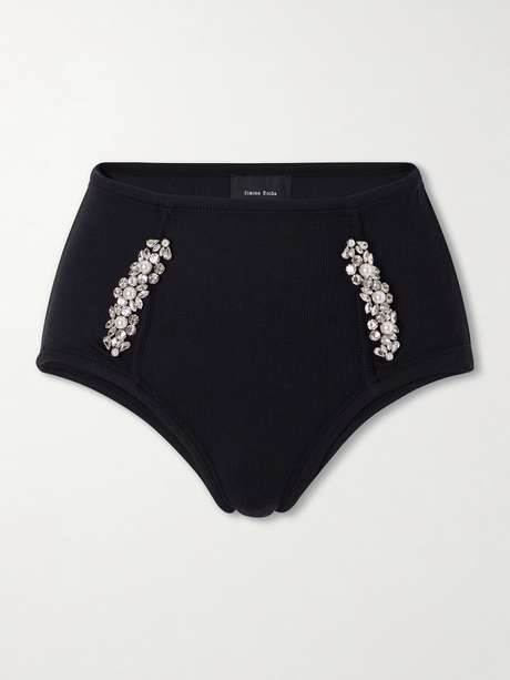 Romanticism with a subversive edge defines the work of Simone Rocha. These high-waisted briefs are crafted from black ribbed fabric in a streamlined silhouette, detailed with crystal floral embellishments at the hips that introduce a note of luminous decoration.