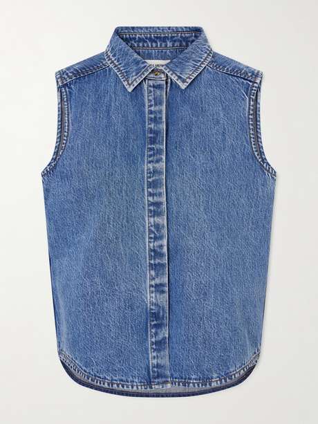 Still Here’s ‘Emma’ shirt reflects the label’s vintage-inspired take on everyday staples. Cut from softly faded denim for an authentic lived-in feel, it’s designed in a sleeveless silhouette with a neat pointed collar and concealed placket.