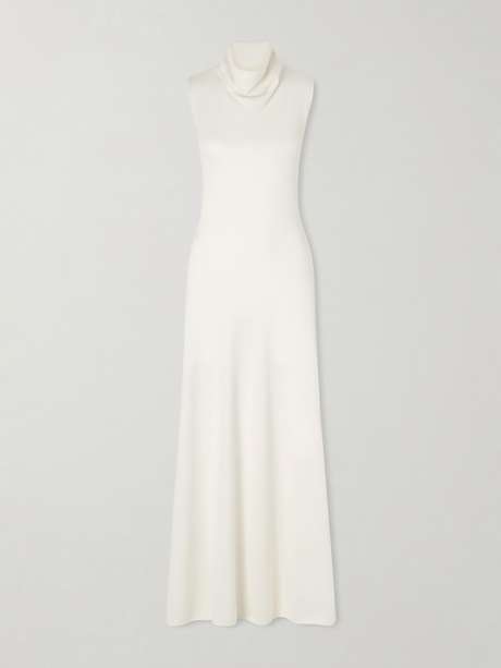 TOM FORD's dress has been knitted on circular looms to create its seamless finish – it makes the drape all the more exquisite. Knitted from two fine gauges of wool-blend piqué, it feels columnesque with a raised cowl neck and sweeping maxi hem.