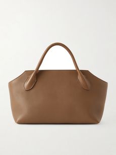 Items clockwise from top left: loafers, Khaite; wide-leg pants, The Row; sweater, Jil Sander; pumps, Versace; bowl, Completedworks; light-brown tote, The Row; necklace, Sophie Buhai; dark-brown intrecciato shoulder bag, Bottega Veneta; shirt, Auralee