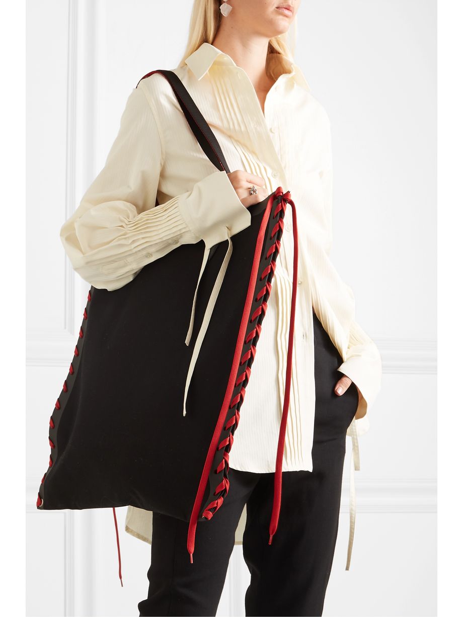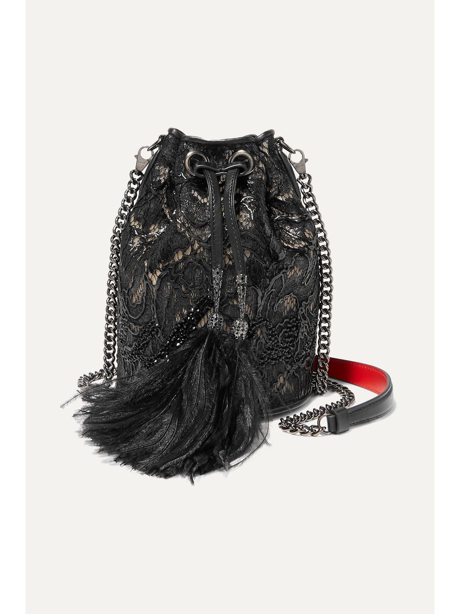 Marie Jane feather and leather-trimmed crystal-embellished lace bucket bag