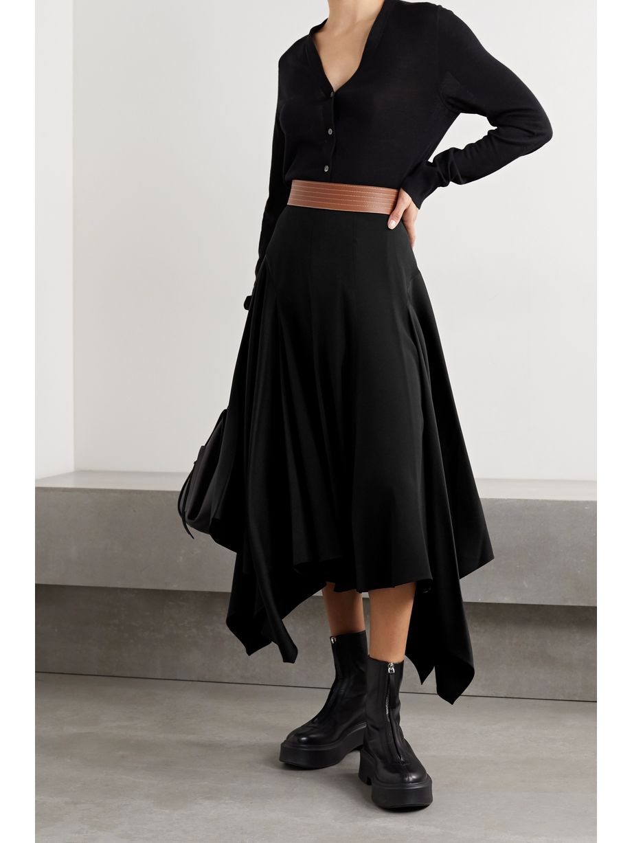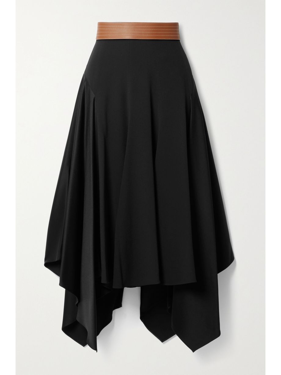 Asymmetric leather-trimmed crepe and satin midi skirt