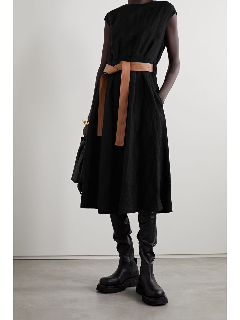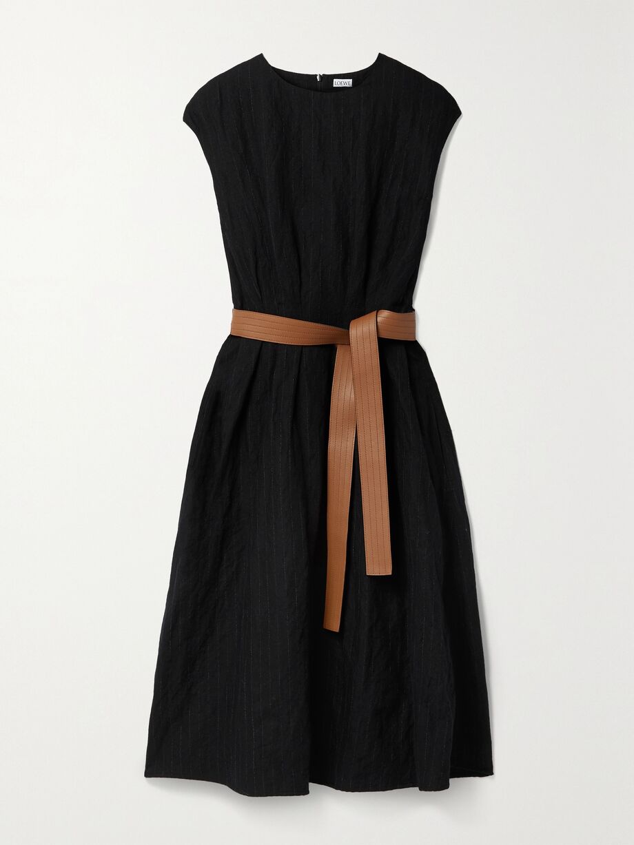Leather-trimmed belted metallic wool-blend twill midi dress