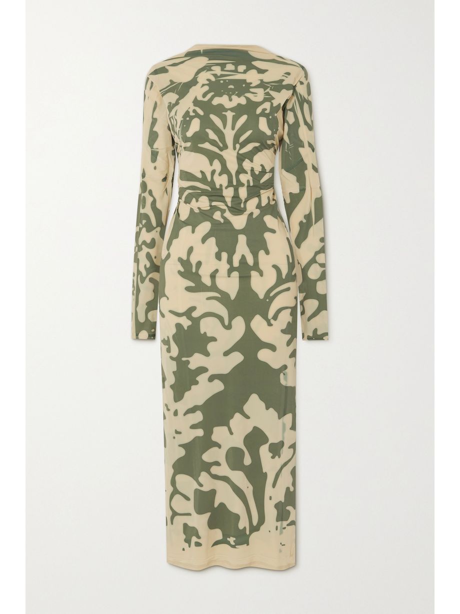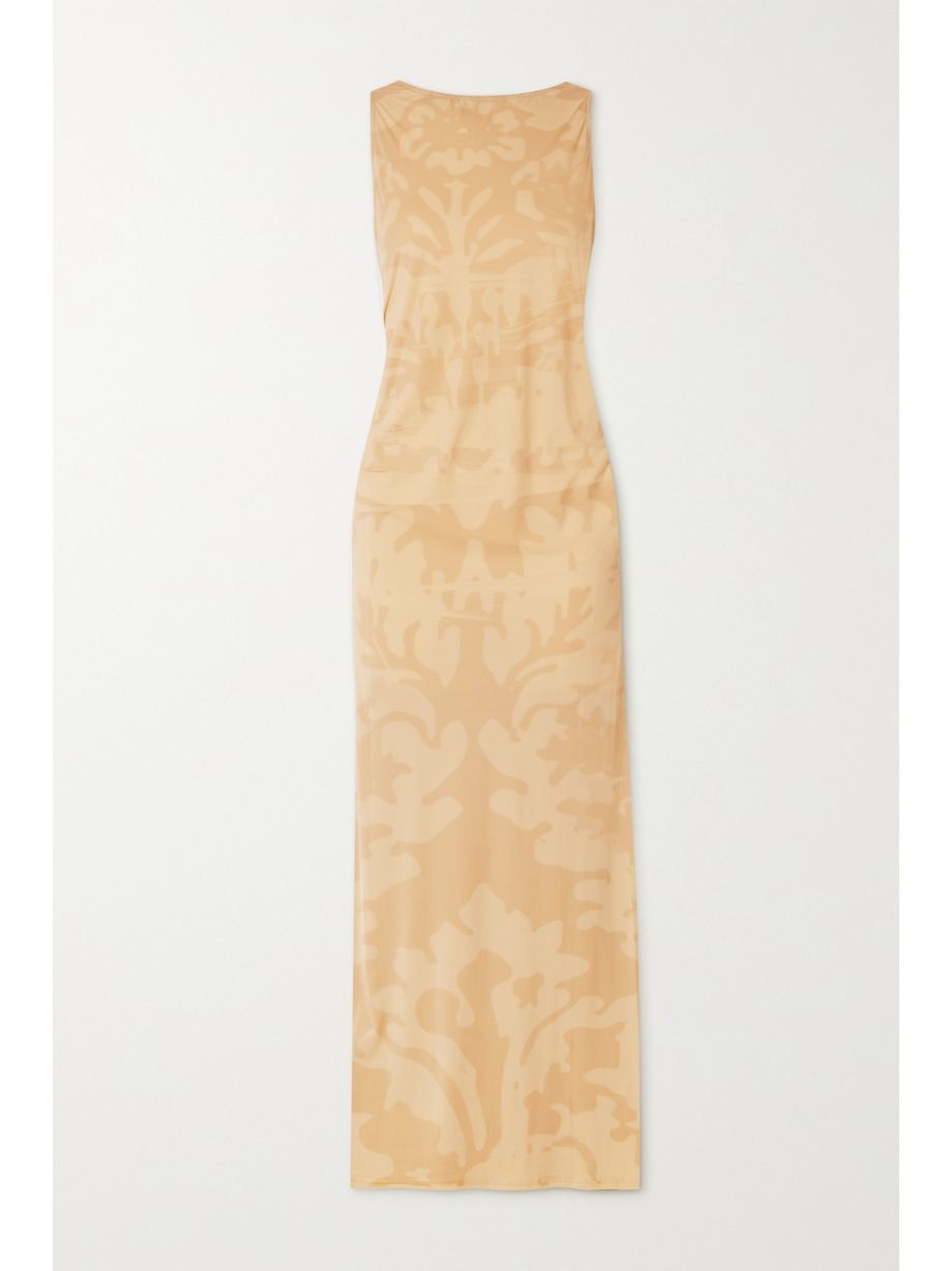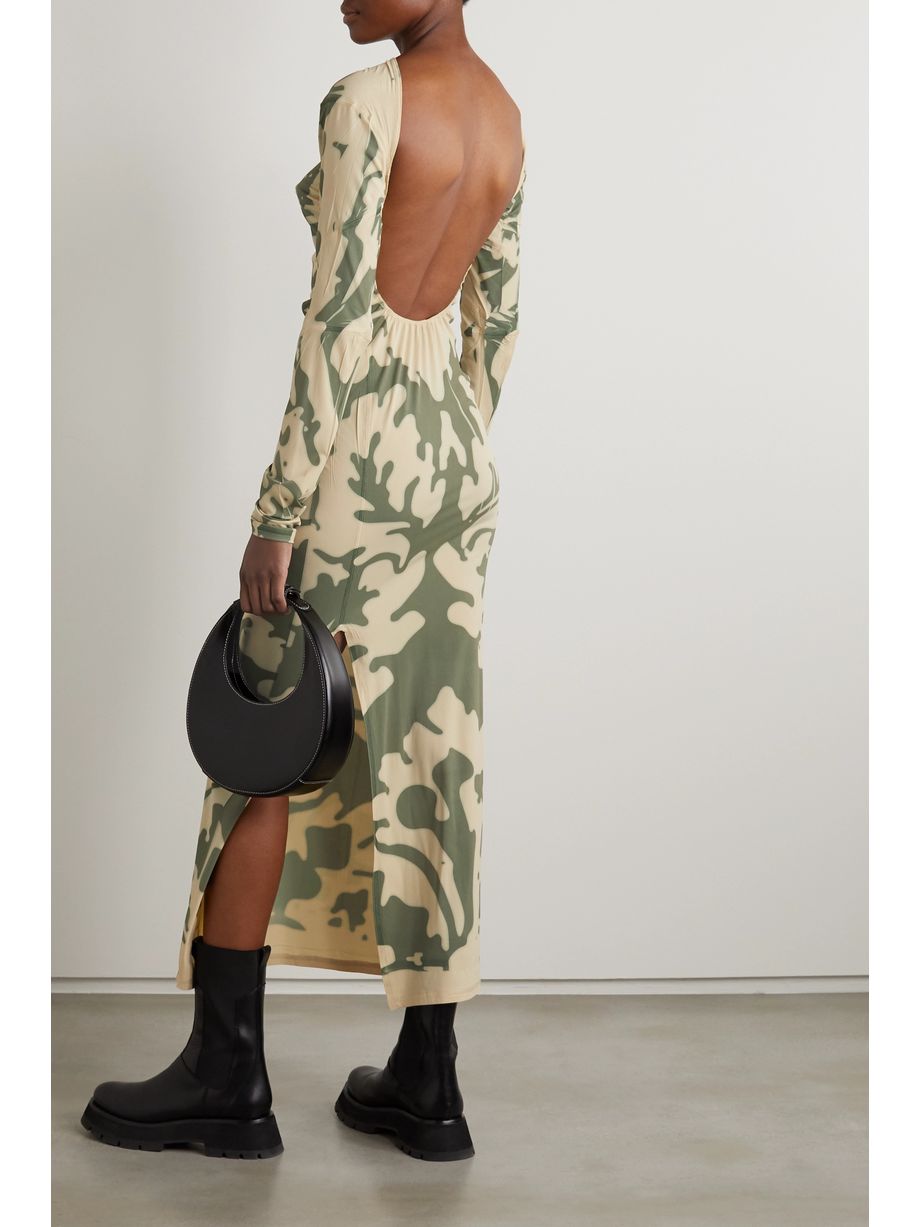 Open-back printed stretch-mesh maxi dress