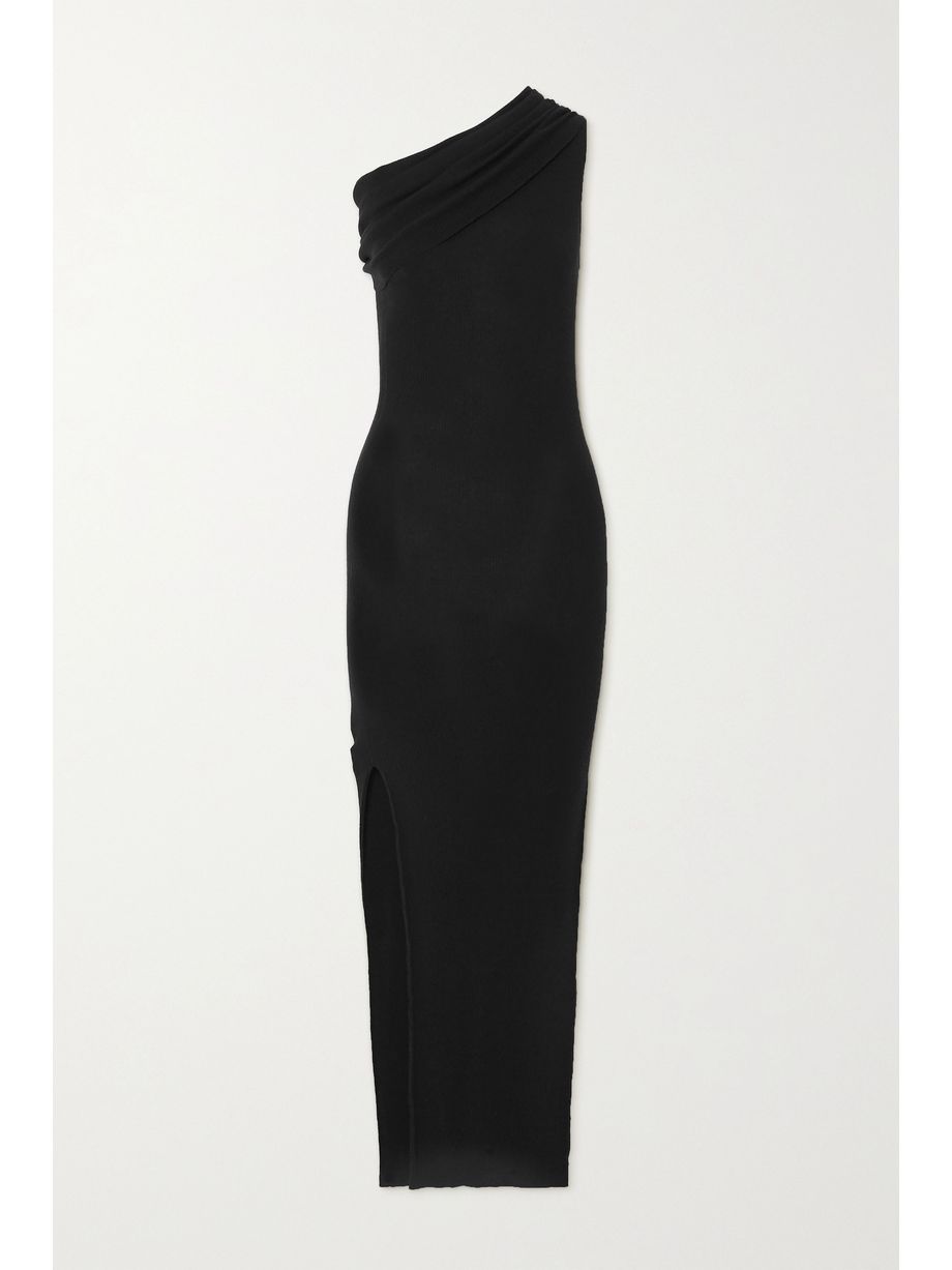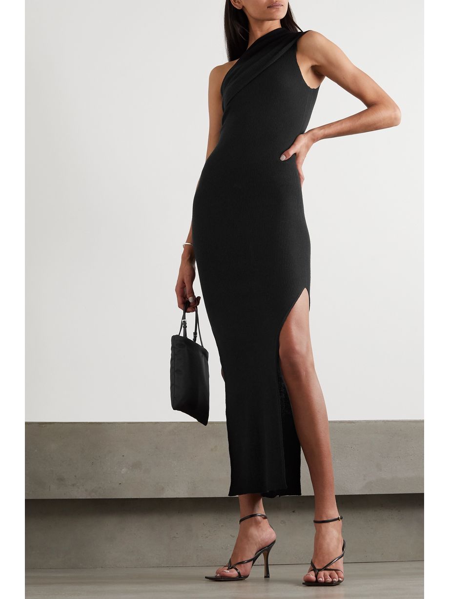 One-shoulder draped ribbed wool dress