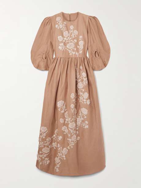 Agua by Agua Bendita often looks to Latin America’s rich biodiversity for inspiration, as seen in this ‘Raquel’ dress embroidered with dimensional blooms. Cut from breathable linen, it features voluminous three-quarter sleeves and a cascading maxi skirt that moves with ease.