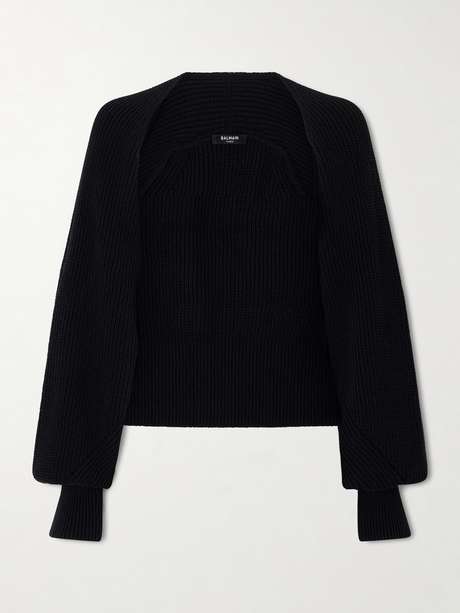 Balmain's bolero-inspired cardigan has a sculptural sensibility. Rib-knitted with touches of cotton and Lyocell, it has voluminous blouson sleeves and rounded shoulders. Complement the logo-engraved gold-tone plaque with vintage earrings.