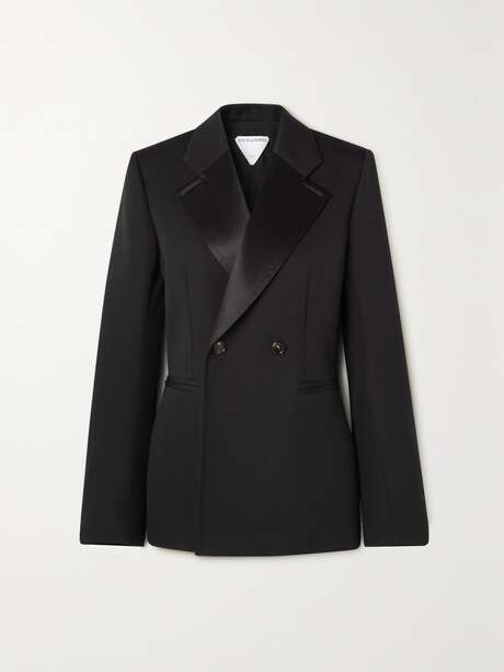 BOTTEGA VENETA Double-breasted satin-trimmed grain de poudre wool blazer