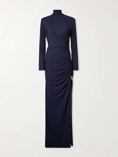 It's the thoughtful details that make Bottega Veneta's simple dress feel so elevated. Made from slinky jersey for a close, body-skimming fit, it has an elegant turtleneck and ruching along the side that draws the eye in to the signature 'Knot' hardware just above the thigh-grazing split.