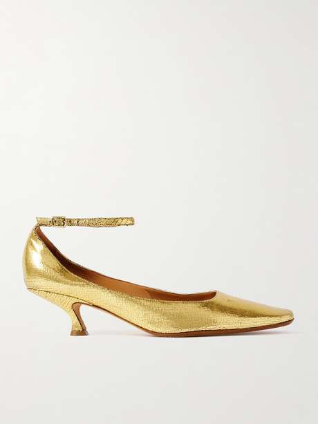 Calvin Klein Collection's 'Anna' pumps are minimal in design, yet the cracked, metallic finish makes them so eye-catching. They're made from leather with squared-off pointed toes, slim ankle straps and angular kitten heels.