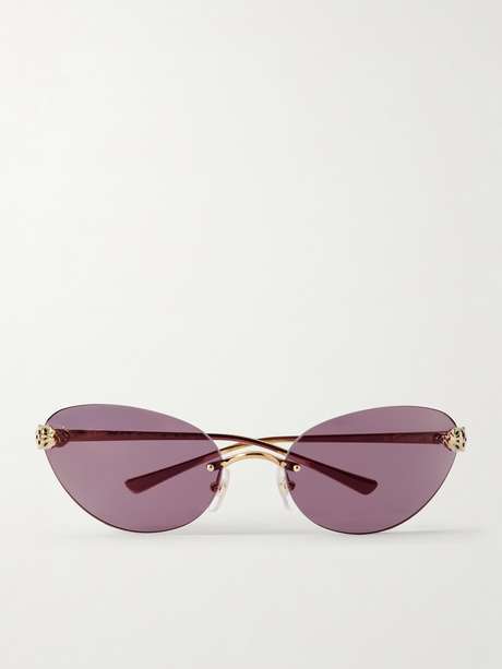 Cartier Eyewear's sunglasses feature the house's iconic panther heads on each temple, symbolizing strength and courage. They've been made in Italy from gold-tone metal with rimless, violet cat-eye lenses.