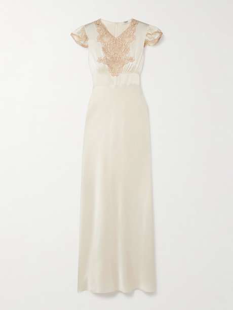 Chloé's dress made its debut on the label's Winter '25 runway, teamed with ballet flats and a chain-strap bag. It's bias-cut from silk-satin with a pearly luster and trimmed with corded lace through the neck and on the ruffled cap sleeves. It would make a stunning choice for the bohemian bride - and you would definitely wear it again.